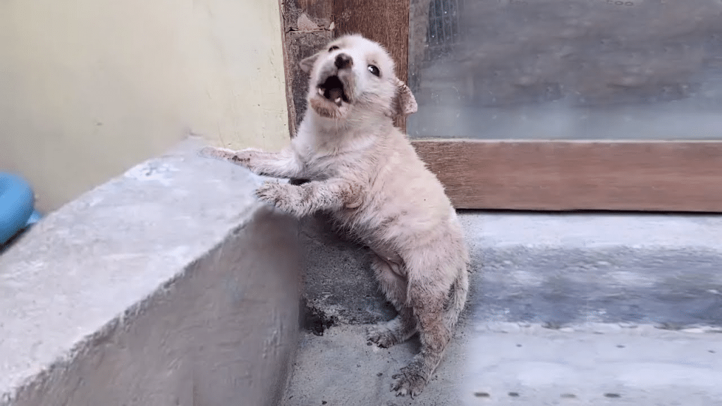 The stranger crouched beside her, speaking softly, offering comfort without expecting anything in return. The puppy didn’t run — she couldn’t. Instead, she let out the smallest sound, a tired whimper that felt like a plea for help.