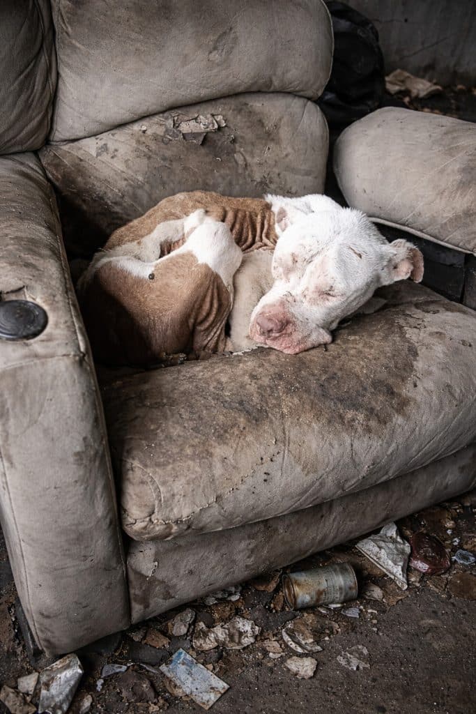 Inside, Aniken lay collapsed on the floor. He could not rise. He could barely lift his head. His body showed the damage of prolonged neglect — extreme malnutrition, infections, and severe dental disease. Beside him stood the female dog who had protected him when he no longer had the strength to protect himself. It was clear: he had not been alone, even in his weakest moments.