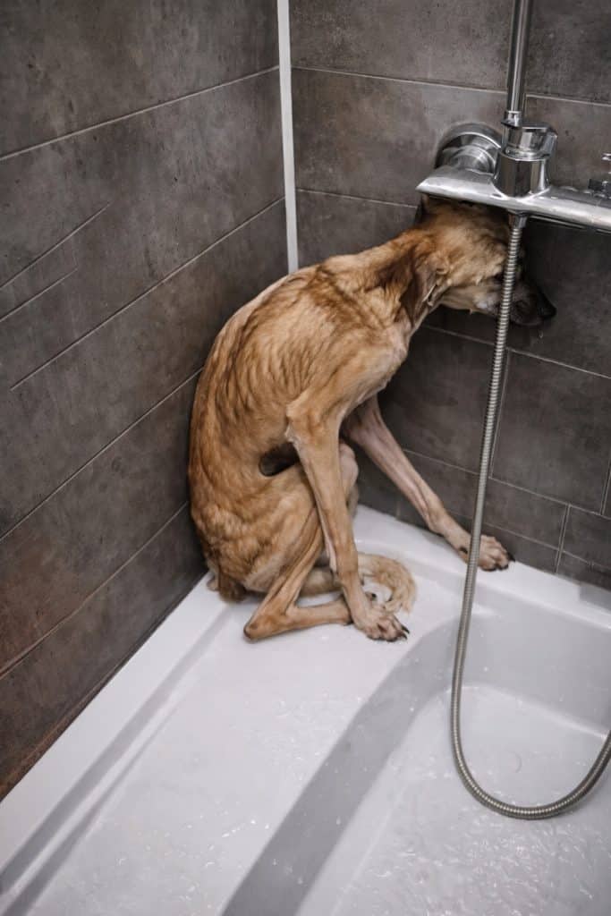 A passerby noticed the small dog and understood immediately that time was running out. Carefully, he lifted Screech from the ditch and brought him home. The first step was simple, but heartbreaking — a bath to wash away layers of mud, fleas, and neglect. Screech stood trembling in the tub, too weak to steady himself, unsure of what was happening. Gentle hands and calm voices were all that kept him from collapsing in fear.