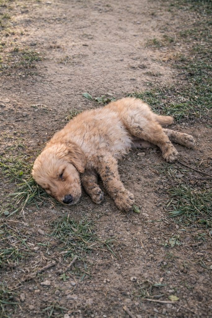 During an ordinary walk, a couple suddenly heard a weak, broken cry drifting from nearby. Following the sound, they discovered a tiny dog lying motionless on the ground. His body was painfully thin, his fur matted with dirt, flies hovering around him. When they touched him, his skin burned with heat. Later, they would learn his temperature had risen to a dangerous level.