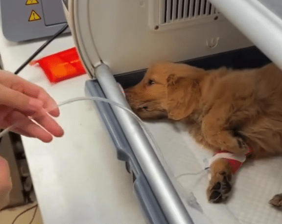Without hesitation, the couple rushed him to a veterinary hospital. Doctors quickly identified a severe intestinal infection caused by prolonged starvation and contaminated food. His fever had reached a critical point. Treatment began immediately — fever reduction, antibiotics, fluids — and he was placed in a separate recovery room, resting on a heated bed inside a protective incubator.