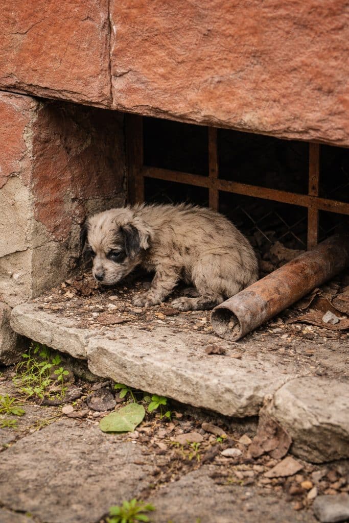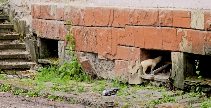 The search led him to an old, decaying building. The place was quiet, damp, and nearly empty. The three dogs mentioned in the call were nowhere to be seen. Instead, tucked deep inside a narrow wall crevice, he noticed movement. A small black-and-white dog, soaked, dirty, and shaking, pressed himself tightly into the gap as if trying to disappear.