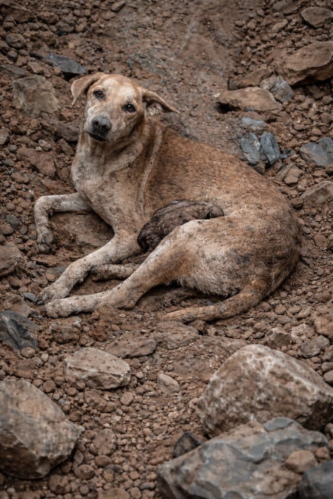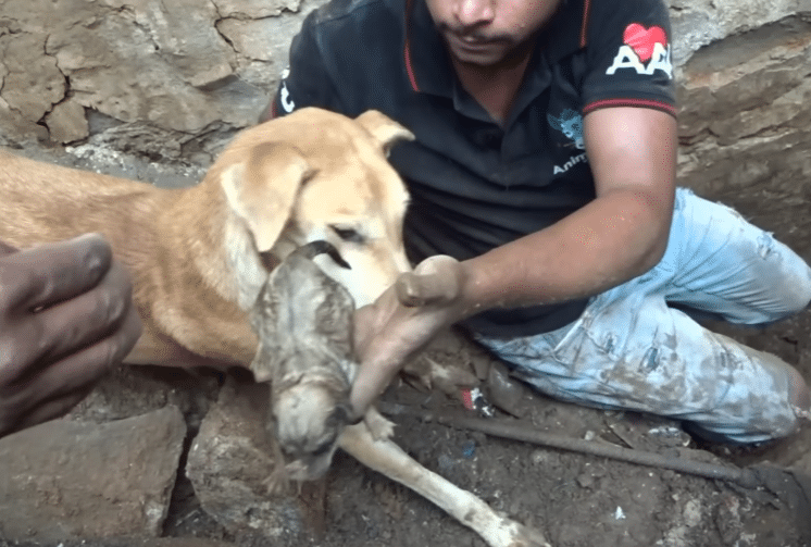 As the team moved closer, the mother dog did not run away. Despite her anxiety, she stayed close, watching every movement. Again and again, she returned to the same spot, signaling insistently. Her body trembled, but her actions showed trust — a quiet belief that these strangers could help her save her babies.