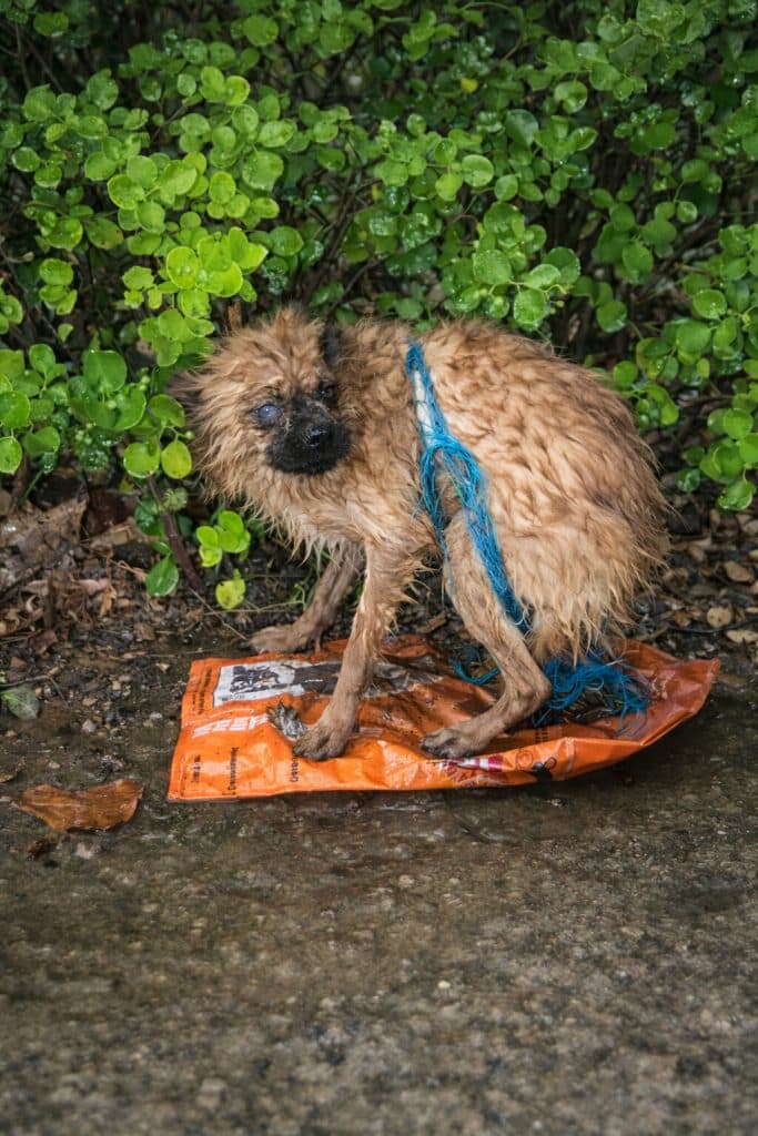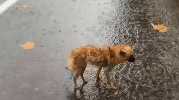 On a stormy day, as heavy rain fell relentlessly, a small dog was spotted wandering along a busy highway. His body was soaked, his movements unsteady, and his thin frame struggled against the wind. What stopped rescuers in their tracks was what wrapped tightly around his belly — a piece of netting that restricted his movement and caused visible distress. Alone in the rain, he looked exhausted, frightened, and dangerously close to collapse.