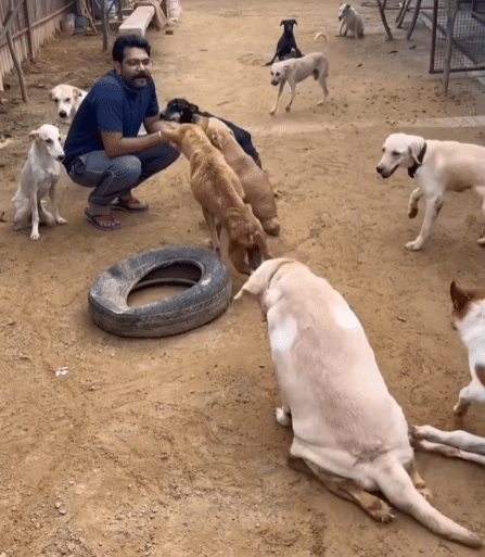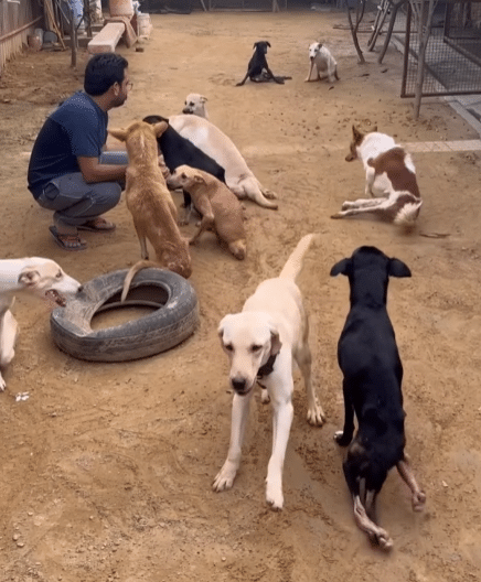 A man sits down directly on the ground, choosing to be surrounded rather than standing above them. Instantly, the dogs gather close. Some press against his legs. Others crawl forward, determined not to be missed. One brown dog lifts himself up, resting both front paws gently on the man’s chest, as if offering an embrace instead of asking for help.