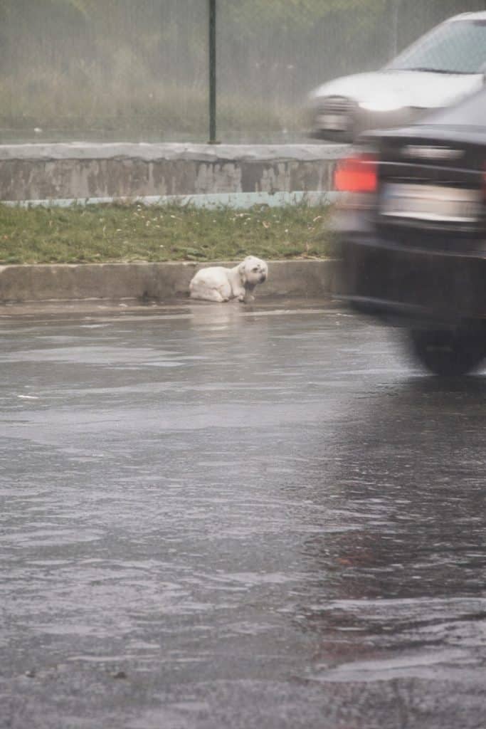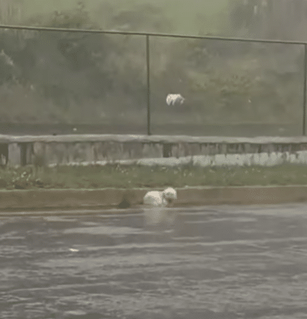 On a day when heavy rain blurred the streets and traffic rushed past without pause, a small cream-colored dog lay curled beside a flooded roadside. His body trembled with cold, soaked through and exhausted. Amid the noise of passing cars, he looked impossibly small—almost invisible—clinging to the edge of the road as water pooled around him.