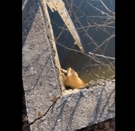 Without hesitation, one rescuer carefully climbed down using a ladder, descending into the darkness below. At first, the dog shrank back, unsure and frightened. His body trembled, not from aggression, but from exhaustion and fear.