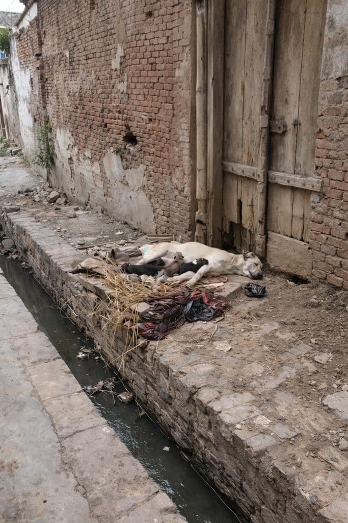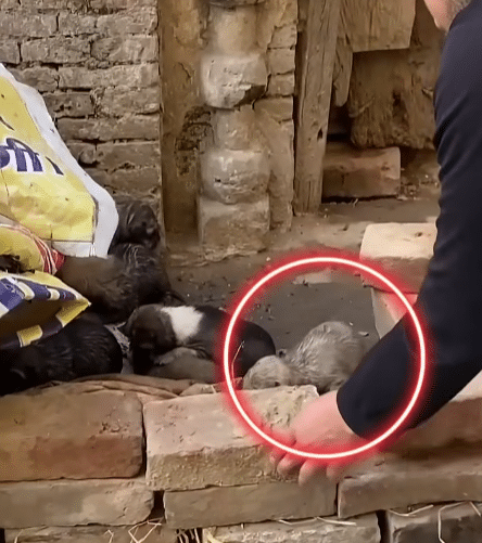 Her puppies were not beside her on the ground, but resting on top of a narrow wall, positioned dangerously close to a drainage ditch below. One slip. One misstep. That was all it would take.