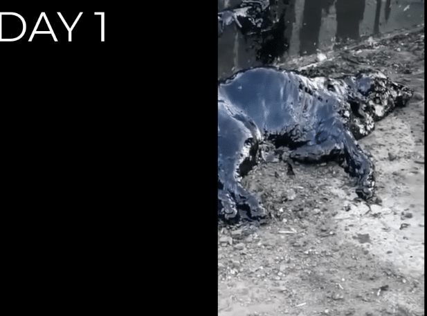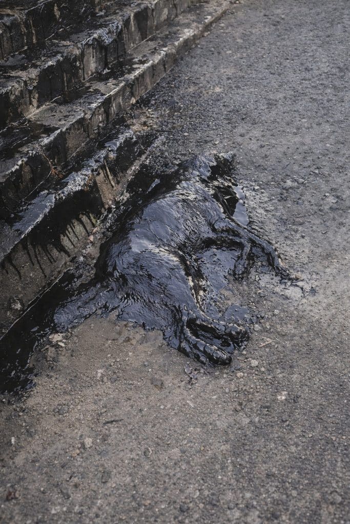 At the bottom of a thick pool of asphalt, a female dog lay completely still. Her body was sealed beneath a hard, black coating, frozen in place as if time itself had stopped. Those who found her later said she looked less like a living animal and more like a statue shaped by pain.