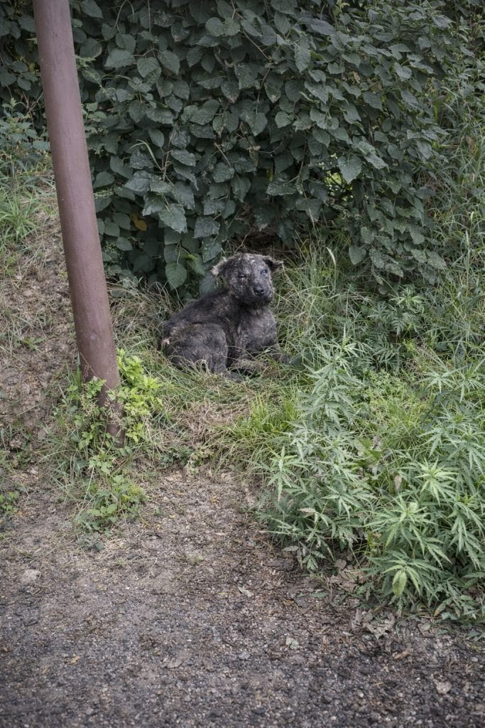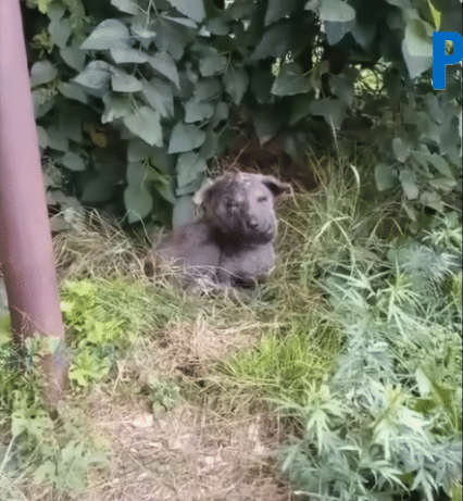 Hidden deep inside a patch of bushes in a quiet, empty area, a dog lay completely still. At first glance, it was hard to tell what he was.