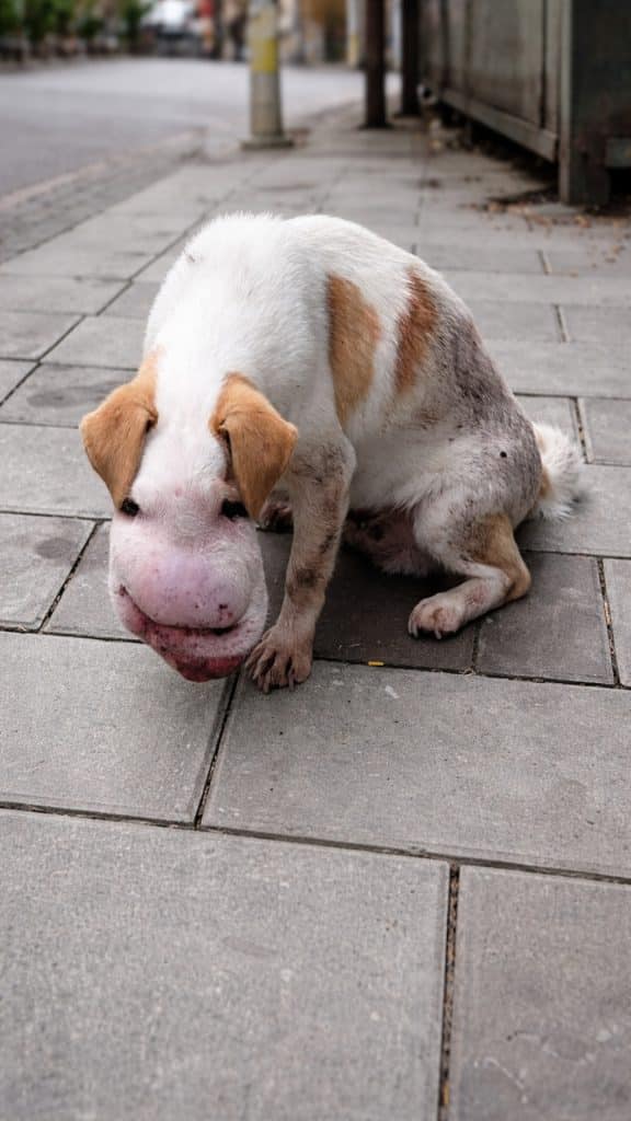 For a long time, the dog survived on the edges. He avoided noise and crowds, choosing corners where he could rest unseen. A heavy mass along his side made it painful to lie down or stand back up again, and over time, even his voice disappeared. He no longer barked. Silence became his way of existing.