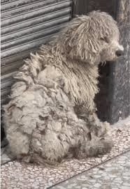 Realizing how urgent her condition was, the man took her straight to a grooming salon. What appeared to be a small dog became almost unrecognizable as the grooming began. Her fur was severely matted, packed with debris, and painful against her skin.