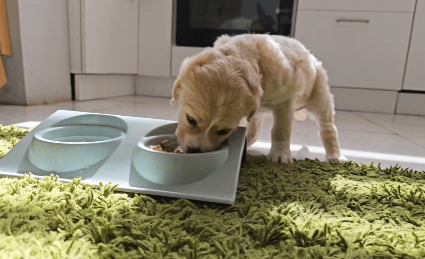 Clean and warm, the puppy enjoyed his first proper dinner. He ate eagerly, then began to explore his new surroundings. On a patch of green carpet, he played—tentative at first, then bolder, discovering toys, space, and freedom.