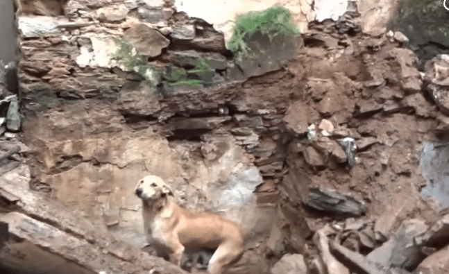 A mother dog was crying beside the ruins of a collapsed house, her voice cutting through the quiet like a warning. When rescuers arrived, they immediately understood this wasn’t panic without reason. She barked insistently, pawing at large stones, circling one spot again and again—clearly trying to show them something hidden beneath the debris.