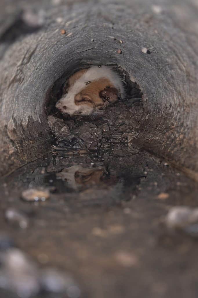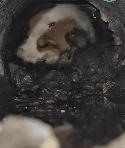 Deep inside a long, narrow concrete pipe, a small white-and-brown puppy lay still. Mud covered his fur. His body looked tired, his eyes wide with fear. Flies circled nearby, a quiet sign that he had been trapped there longer than anyone realized.