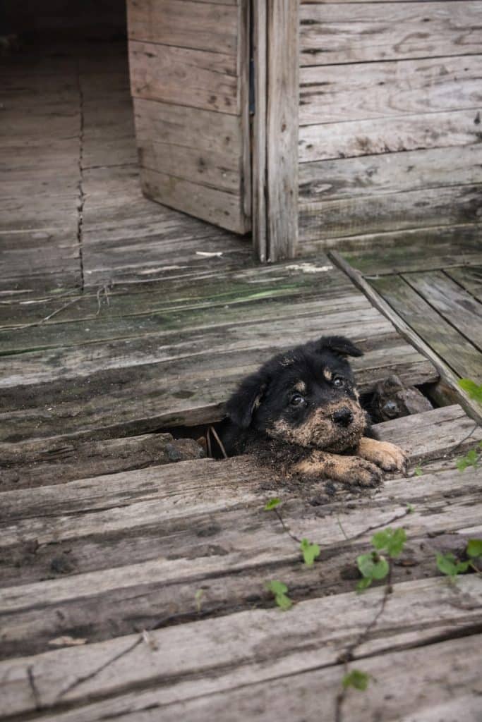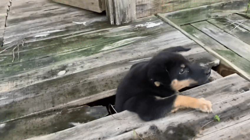 When he looked closer, he saw a small black puppy trapped beneath the wooden floorboards.