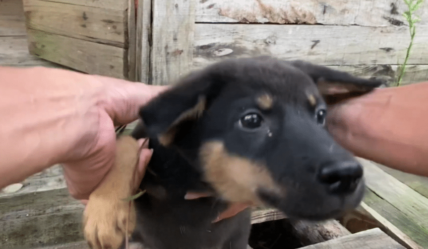 The puppy had tried to squeeze his way out but became wedged between two planks. His lower body was stuck, leaving him unable to move forward or pull himself back. He wasn’t crying or struggling wildly—just lying there, confused and exhausted, waiting for whatever might happen next.