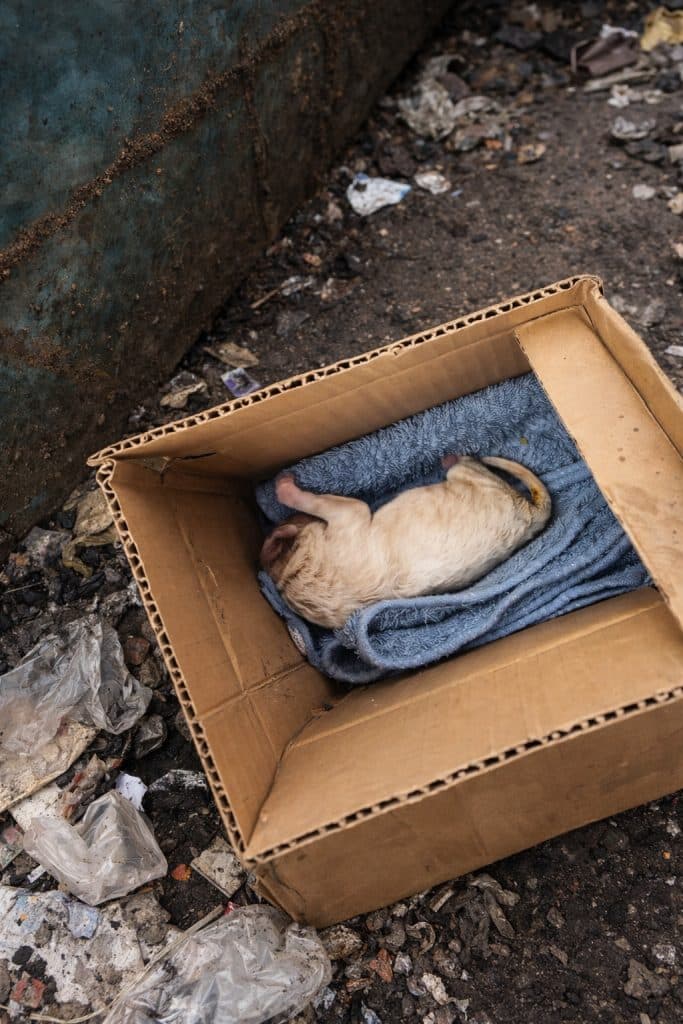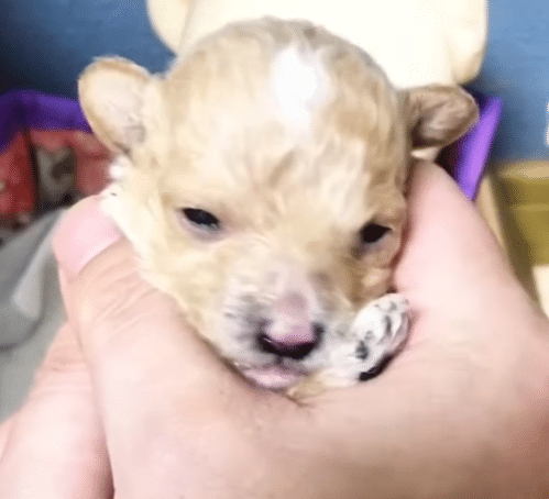 It was an ordinary moment that could have passed unnoticed. Near an apartment complex, a cardboard box sat beside a trash bin, forgotten and still. Inside, barely visible, was a newborn puppy—tiny, fragile, and shaking in the cold. His body was pink and weak, his life hanging by a thread.