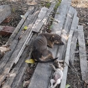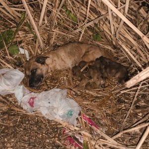 It was dark when someone first saw her. In a patch of overgrown grass scattered with trash and debris, a mother dog lay barely breathing. Her body…