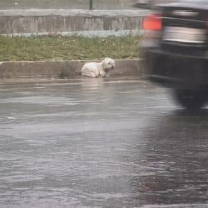 On a day when heavy rain blurred the streets and traffic rushed past without pause, a small cream-colored dog lay curled beside a flooded roadside. His body…