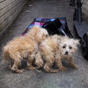 At first glance, they were easy to miss. Pressed deep into the shadows of a quiet street corner, two small puppies crouched so tightly together that they…
