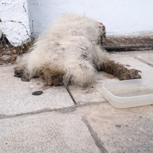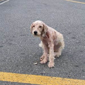 He sat quietly at the edge of the road, where dust gathered and traffic rushed past without a second glance. His fur was dull, uneven, and caked…