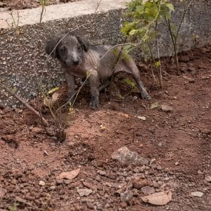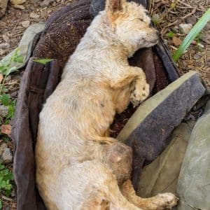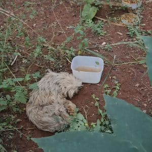 In a dry, overgrown area where few people would stop to look, a small dog lay hidden among the bushes. Her body was thin. Her fur was…