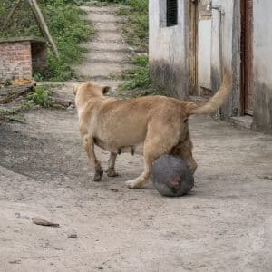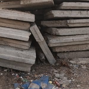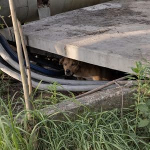 At the start of the video, a brown stray dog is seen hiding beneath stacked concrete slabs in what appears to be a construction site or empty…