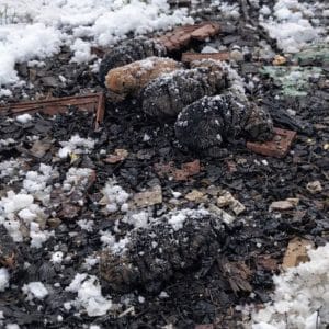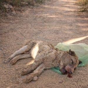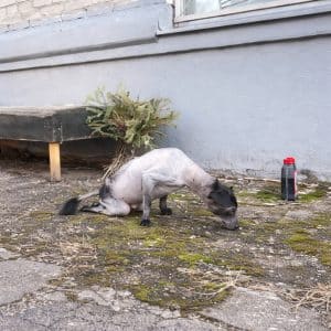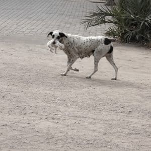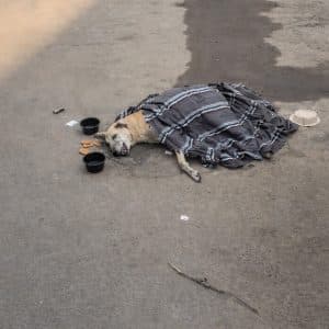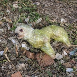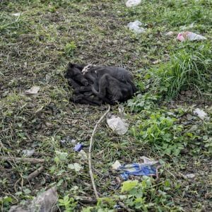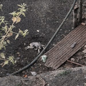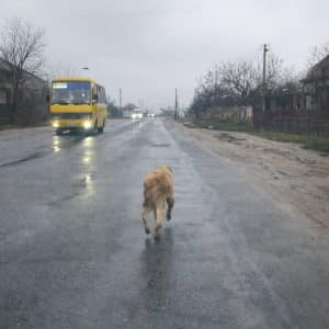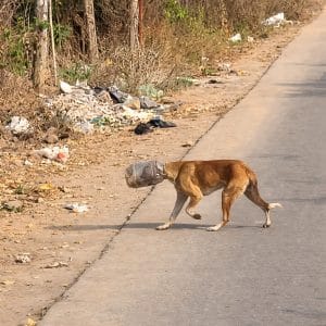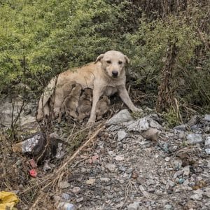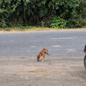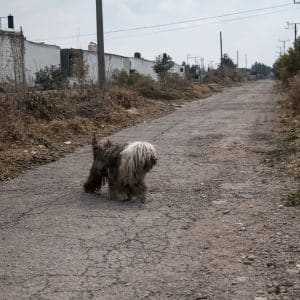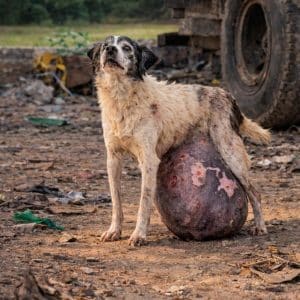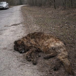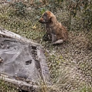 At the beginning of the video, a brown stray dog wanders along the roadside, moving uncertainly through piles of trash and dry bushes. Something is clearly wrong….