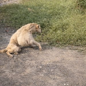 At the beginning of the video, a pale-colored stray dog sits alone by the roadside. He does not move much. What draws attention immediately are the large…