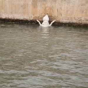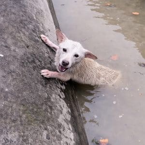 The video opens with a tense scene. A man riding past a concrete-lined canal notices a dog trapped in the water, unable to climb up the high…